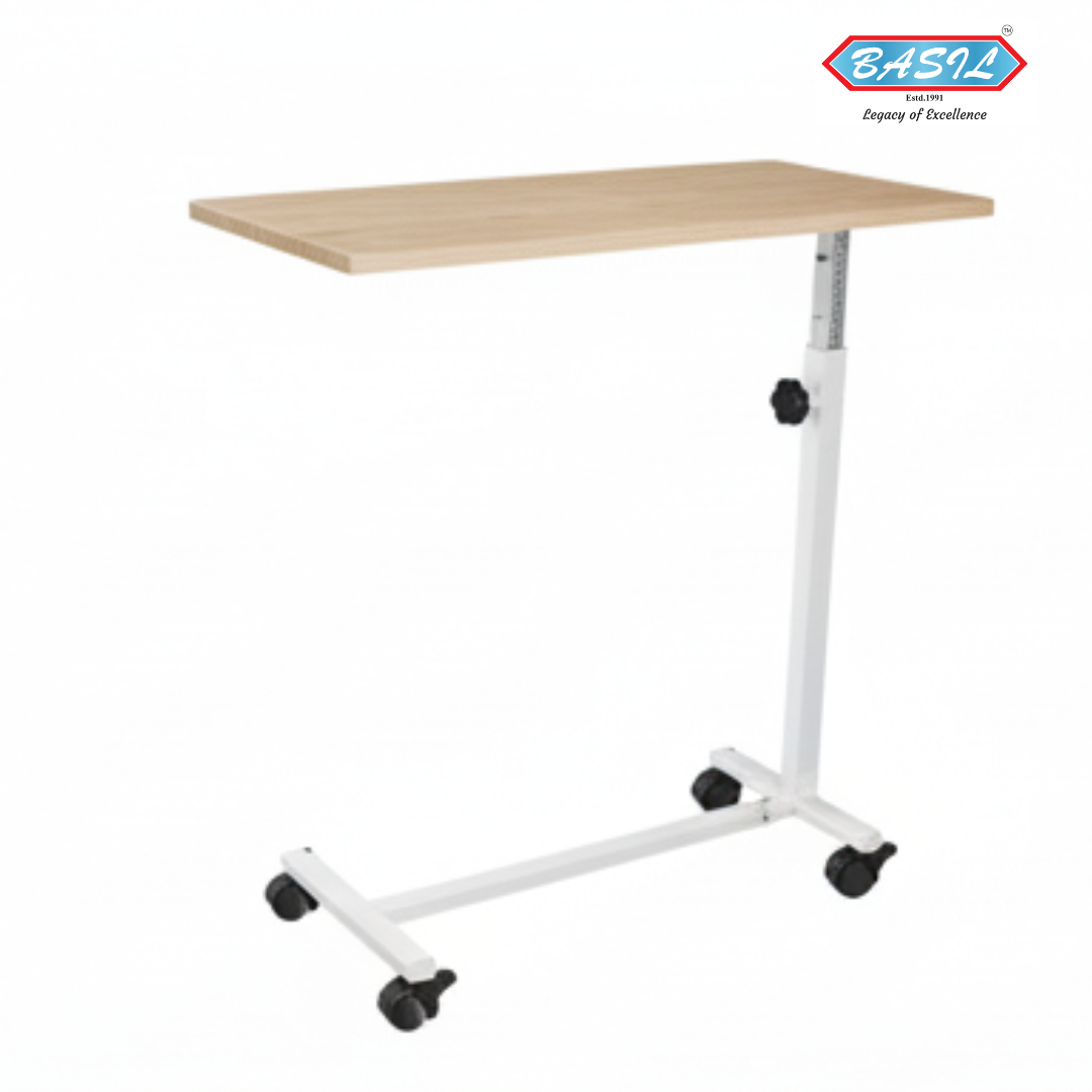 Constructed with a rectangular steel framework, the table provides excellent stability and durability. It is mounted on 2” smooth-rolling castors, allowing effortless mobility between patient rooms or bedside positions. The height of the table can be conveniently adjusted using a side knob, ensuring comfortable use for patients of different bed heights.