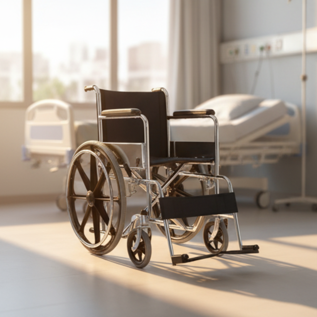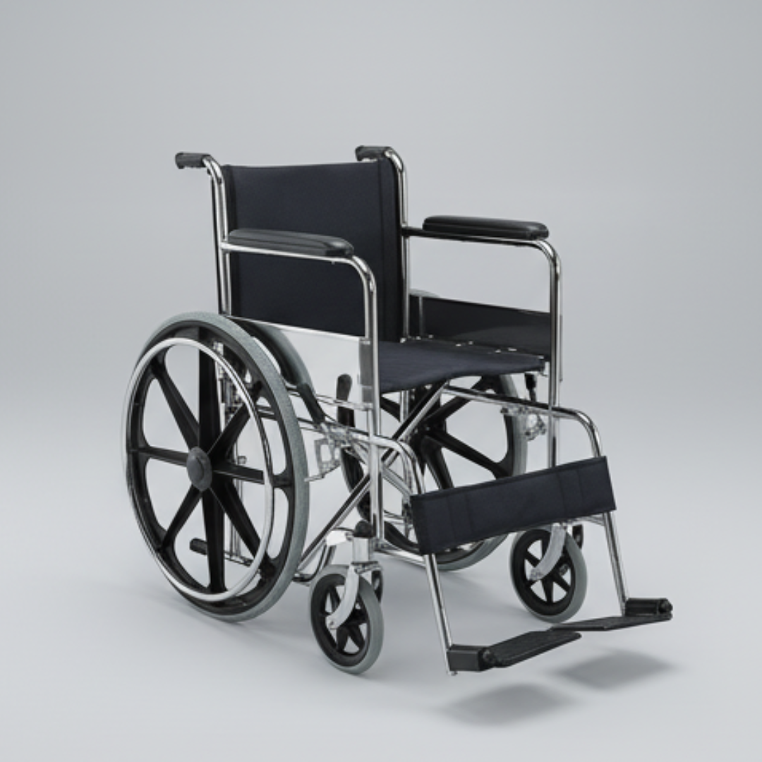 The Folding Wheel Chair is a highly functional and space-saving mobility solution designed for patients who require both comfort and practicality. Built with a chrome-plated steel frame, it ensures long-lasting strength, easy maintenance, and resistance to daily wear. This design makes it a reliable choice for healthcare facilities as well as personal use at home.