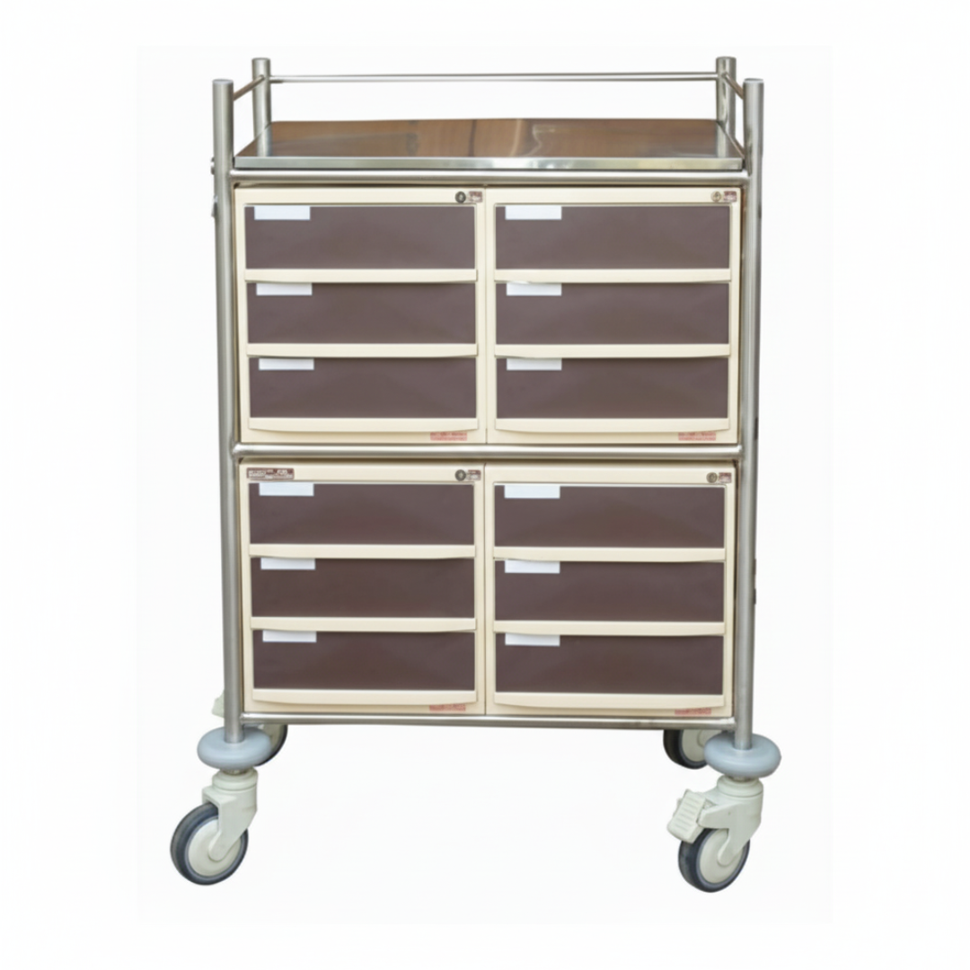 Featuring twelve molded drawers, this jumbo model offers extensive storage capacity for medicines, instruments, and disposable supplies. A stainless steel tray on the top provides convenient workspace for preparation or sorting of medicines. The trolley is equipped with 100 mm diameter smooth-rolling castors, ensuring quiet and effortless movement through hospital corridors and patient rooms.
