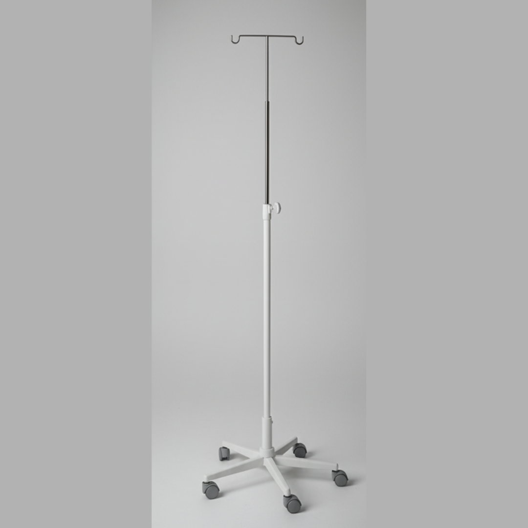 The stand features a five-pronged base fitted with 50mm smooth castors, offering both stability and mobility. Its adjustable I.V. rod (12mm S.S.) can be set to different heights, ranging approximately from 1350mm to 2150mm, providing flexibility for varied patient requirements. Equipped with 2 or 4 stainless steel hooks, it allows simultaneous use for multiple infusions, making it ideal for busy wards and emergency rooms.