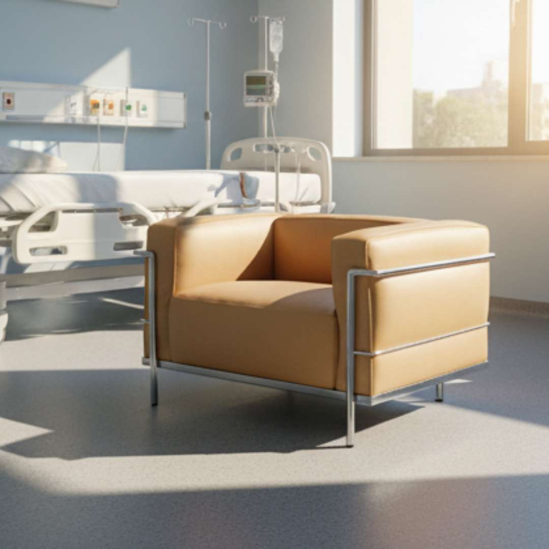 Designed for modern hospital interiors, this chair provides superior support with its thick cushioning and wide armrests.