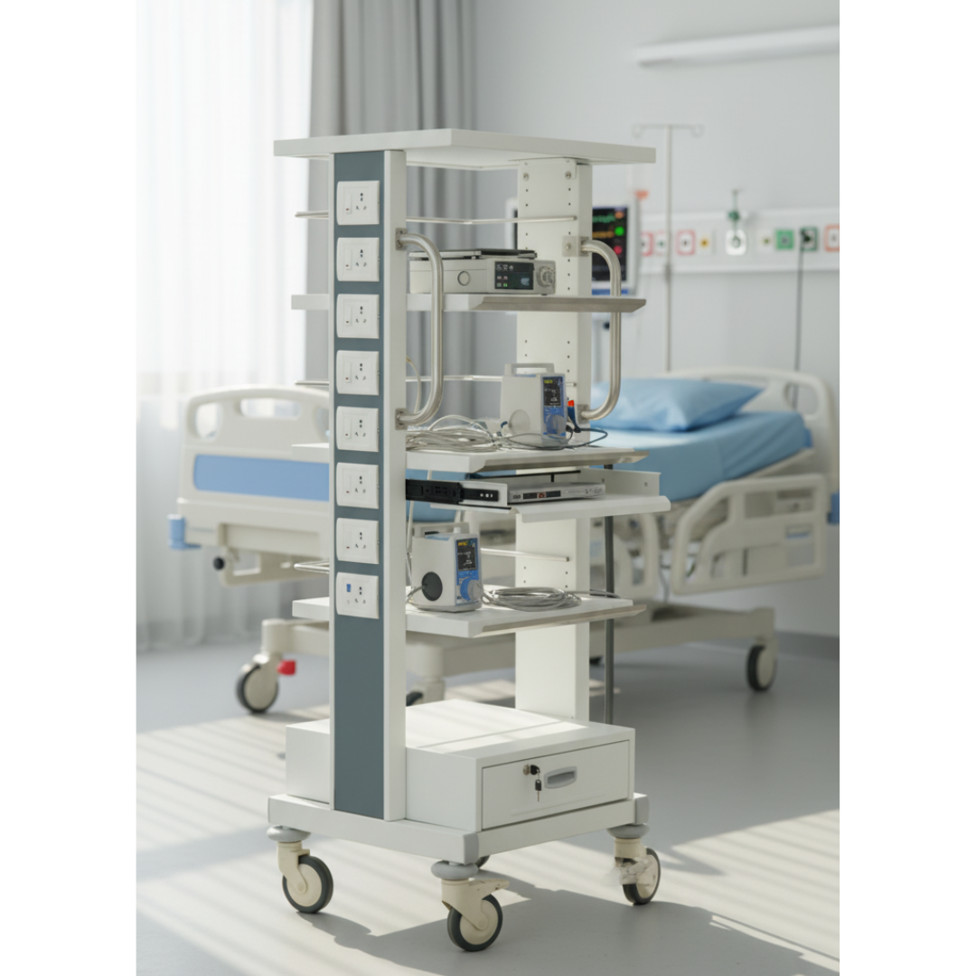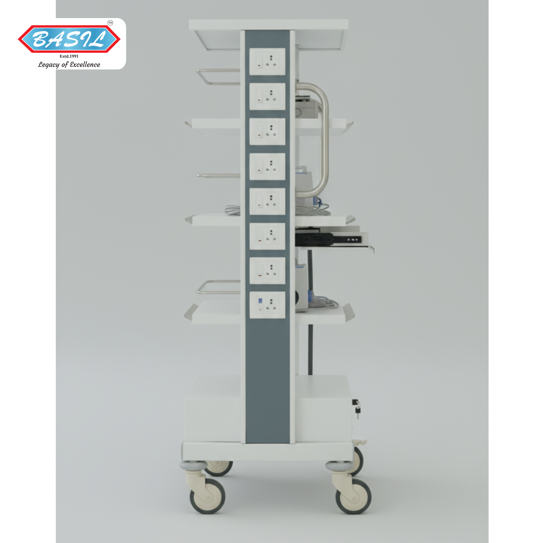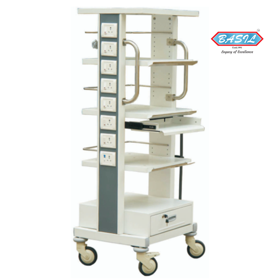 Equipped with top fixed shelves (approx. 560mm L x 460mm W) and multiple adjustable shelves (510mm L x 460mm W), it allows flexible arrangement of medical monitors, printers, and stabilizers. The 40mm shelf adjustment slots offer convenience for organizing vital OT equipment. Additionally, a built-in M.S. drawer at the bottom offers secure space for storing essential tools and accessories.