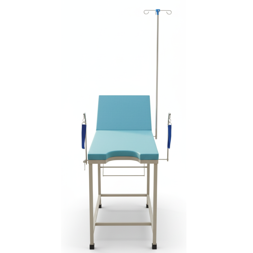 The table also includes provision for an IV stand (optional), expanding its utility for multiple healthcare procedures. The entire structure is pre-treated and epoxy powder coated, giving it a smooth finish while protecting it against rust, scratches, and daily wear.
