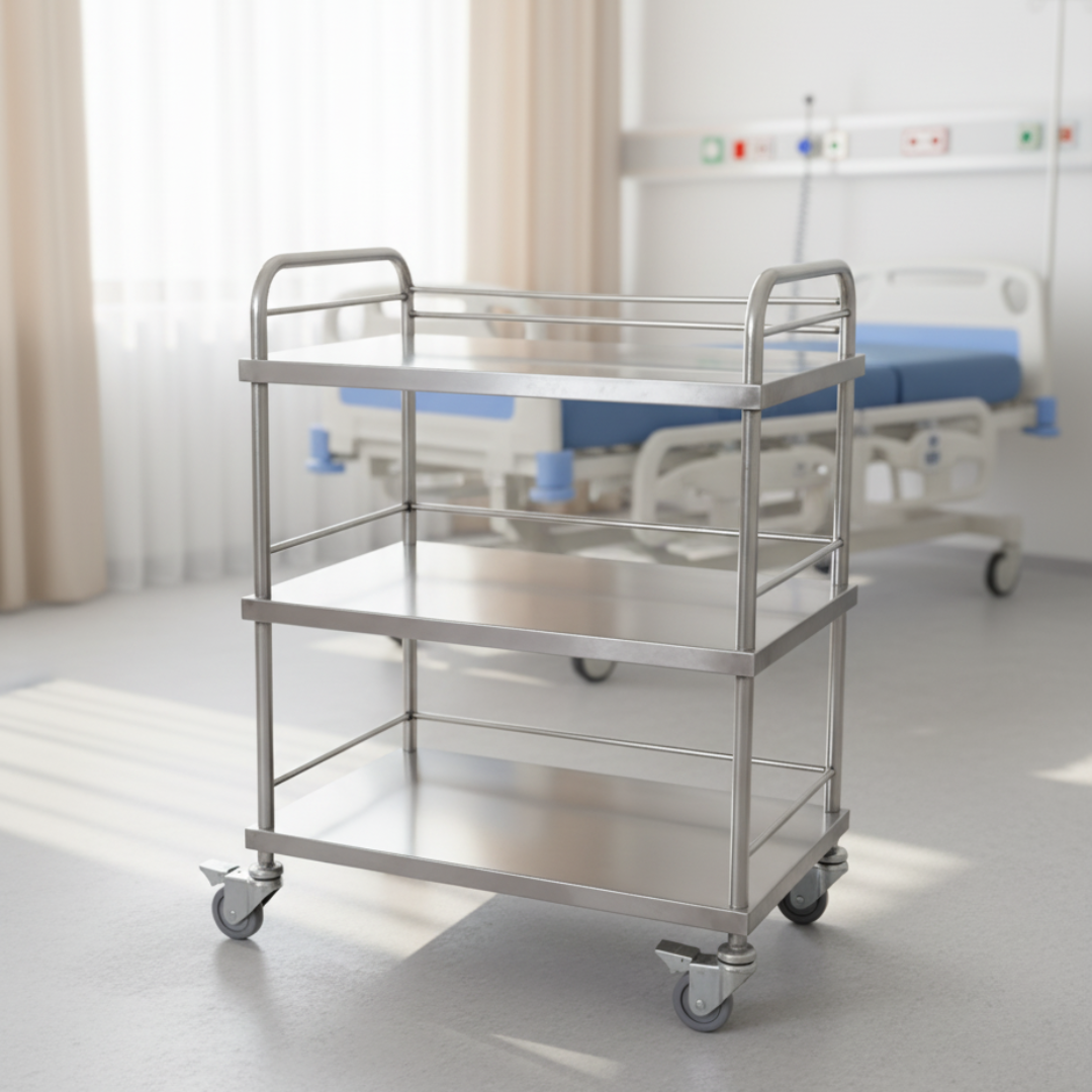 Mounted on 100mm diameter castors, this trolley glides effortlessly even in high-traffic clinical areas. The corrosion-resistant stainless steel finish not only adds durability but also ensures effortless cleaning and compliance with hospital-grade hygiene standards.