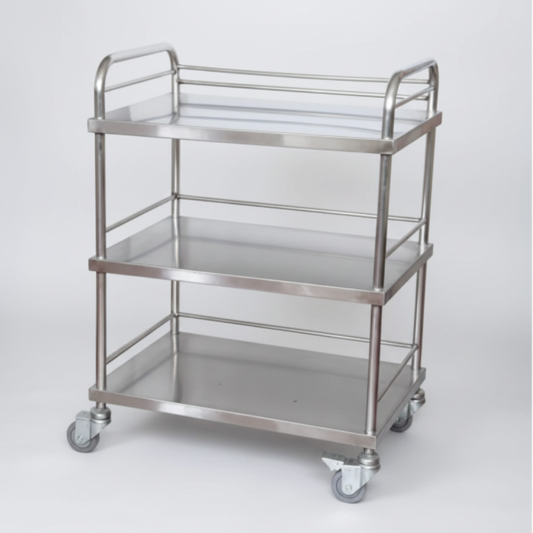 With approximate dimensions of 1000 mm (L) x 510 mm (W) x 1000 mm (H), the trolley is fitted with three spacious shelves, each supported with protective railing—three-side railing on the upper shelf and fixed railing on the bottom—for secure placement of equipment during transit. It provides ample space to organize instruments, trays, and supplies needed in surgical or procedural settings.