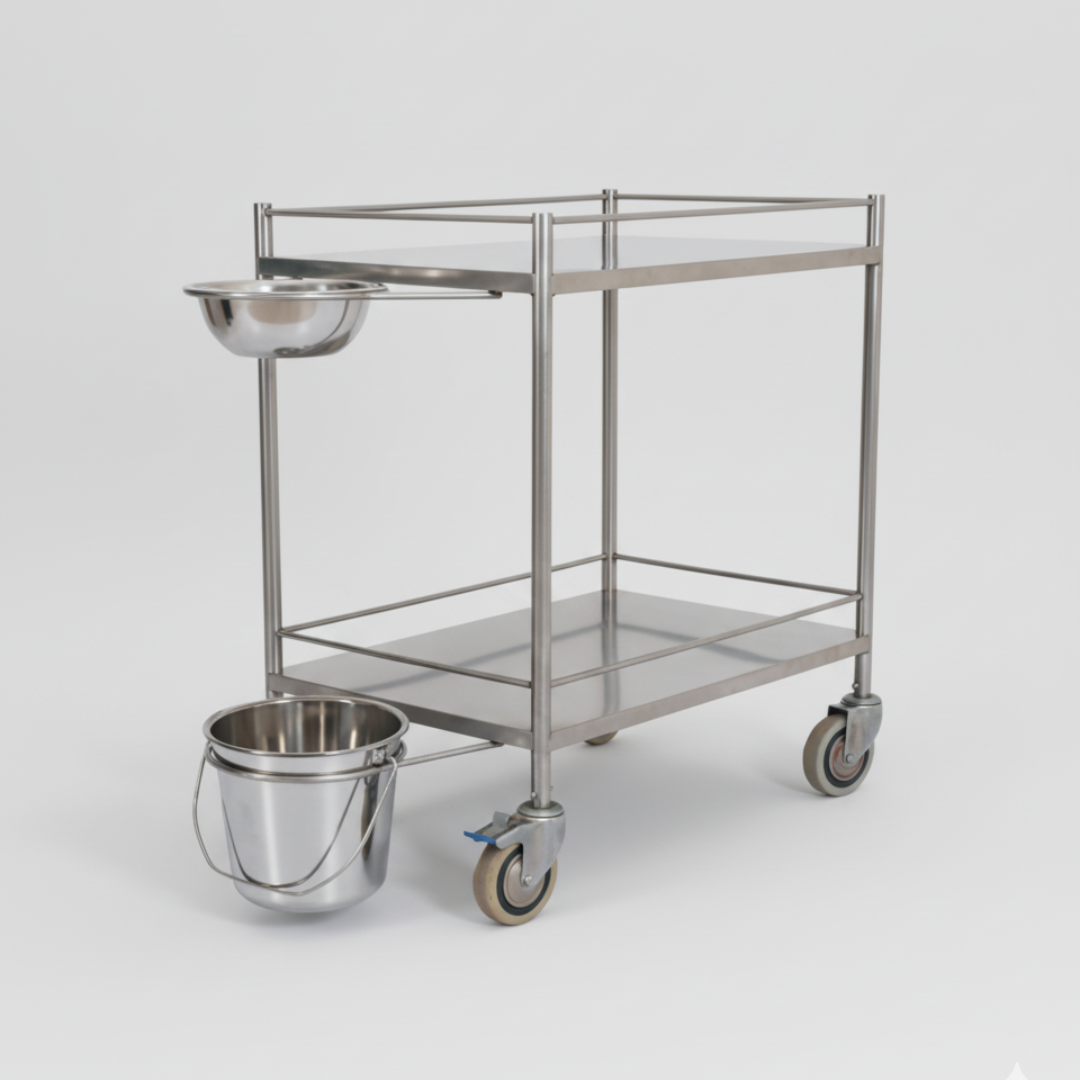 With dimensions of 1000 mm (L) x 510 mm (W) x 1000 mm (H), this trolley offers ample working surface and storage. It is equipped with an upper stainless steel top featuring four-side safety railing to secure medical instruments during movement. A high-grade stainless steel bowl and bucket are attached to facilitate waste collection and hygiene management during dressing procedures.