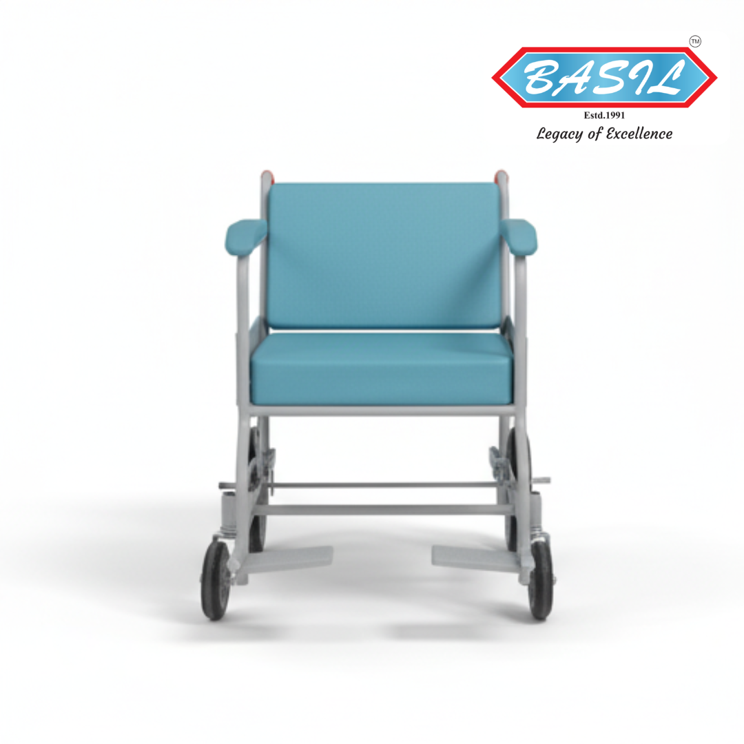 The chair features a cushioned seat and backrest upholstered in premium rexine, offering both comfort and easy cleaning. Fixed cushioned armrests provide stable support for patients during sitting and transfers. For added convenience and safety, the BE-0311 comes with 6-inch front wheels and 12-inch heavy-duty rear solid wheels fitted with brakes to ensure controlled movement. An optional folding footrest with a safety belt further enhances patient security during use.